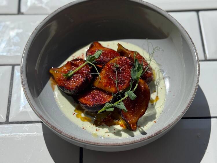 Ce midi-là, l’ardoise (réinventée tous les trois jours) lançait les festivités avec de délicates tagliatelles de courgettes, subtilement croquantes et coiffées de micro-pousses de petits pois sur un gaspacho rouge éclatant, raclé jusqu’à la dernière cuillère. S'ensuivait une salade César tout en efficacité : quelques tranches de poulet panko et une sauce à se damner. De quoi donner envie d’y retourner pour picorer des assiettes à partager à la nuit tombée !
