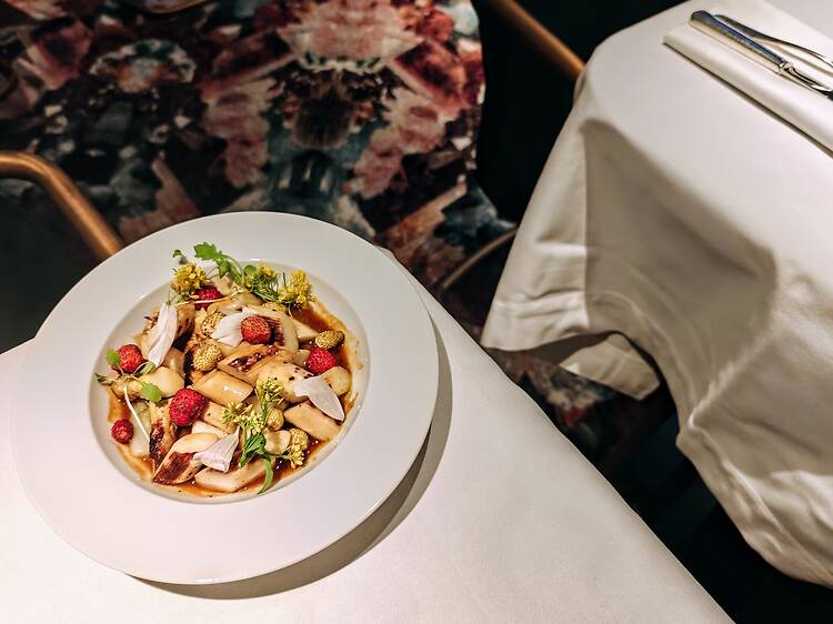 Manger au Bus Palladium, ce n’est pas nouveau. Avant sa fermeture en 2022, le Bus époque Patou déployait déjà – au premier – une salle chicos où l’on pouvait taper dans un tataki de thon ou un burger avant de descendre guincher. En 2026, changement de braquet en cuisine. Le chef marseillais Valentin Raffali (Livingston) signe une carte à la fois personnelle où l’on retrouve ses collisions hardies (tête de veau à la thaï, truite et bouillon de rhubarbe), son amour de la flamme et une saisonnalité stricte ; mais aussi étonnante puisqu'elle ose tourner le dos au Midi pour explorer le pays basque. Les asperges fumées fondent en bouche, les langoustines s’électrisent à la sauce XO… La ligne du Bus ? Une cuisine qui bouscule (un peu) une adresse plus bling que rebelle, mais dont les prix confirment que le rock est une affaire de riches.
