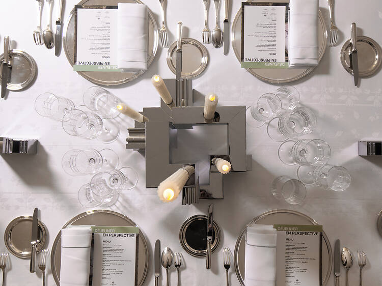 Ancien compagnon du devoir, Mathias Kiss, passionné d’artisanat, a été invité par le Meurice pour investir une suite et entrer en résonance avec les plats du chef Amaury Bouhours lors de deux dîners, les 29 et 30 janvier. L’artiste a conçu Liquid Mirror, une installation éphémère en mosaïque de miroirs descendant du plafond, qui répond à la table tout argent signée Christofle. Dans les assiettes, Amaury Bouhours déploie sa cuisine contemporaine et épurée : Saint-Jacques de Saint-Malo, radis ; veau grillé, chou de Pontoise et houblon… Le prix de l’expérience : 250 €.