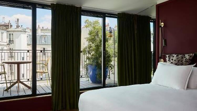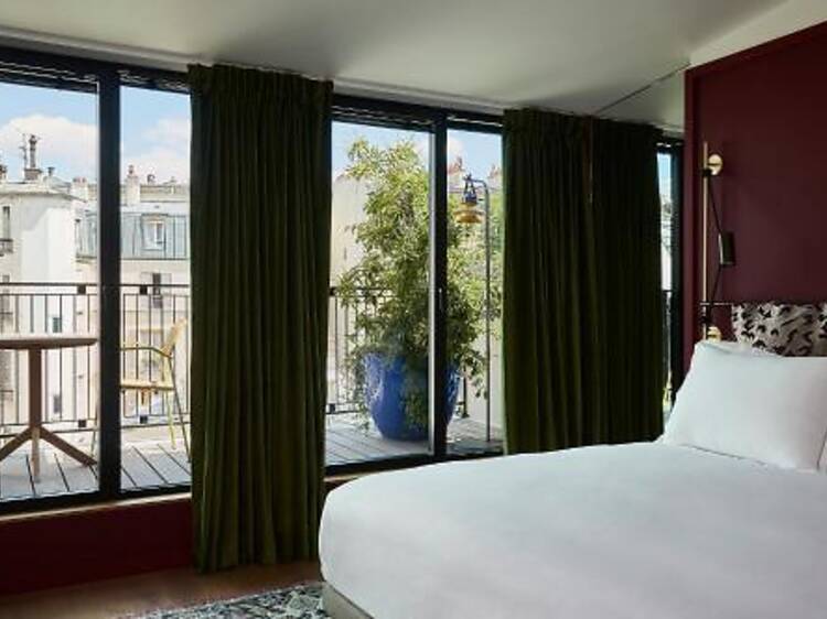 Entre Montmartre et Saint-Georges, au cœur du quartier de la Nouvelle Athènes, Le Ballu n’est ni bateau ni ballot. Méli-mélo d’orientalisme et de surréalisme, cet hôtel au décor inspiré des aventures de Tintin en Syldavie (pays fictif des Balkans imaginé par Hergé) s'affranchit de toutes les cases dans lequel on pourrait le ranger. Chic mais ludique, Le Ballu trouve son équilibre dans un tohu-bohu d’éléments graphiques étrangement cohérents. On kiffe particulièrement les multiples ouvertures sur l’extérieur, avec ces quelques terrasses en suites qui font vraiment la diff, ou ce patio vert et ombragé dans le prolongement du restaurant. Et pour continuer de buller en paix : la jolie piscine et son sauna sont privatisables gratuitement.