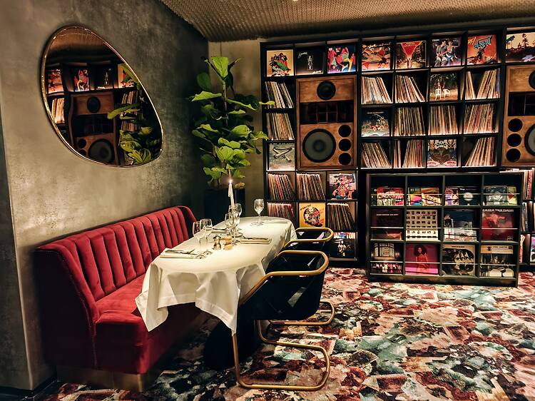 Après les Bains et avant le Palace, une autre légende parisienne des nuits boomeuses tente un come-back. C’est Chapitre Six (Hana, La Folie Barbizon) qui conduit ce nouveau Bus Palladium devenu hôtel 5 étoiles. Si vous étiez un habitué, apprêtez-vous à ne rien reconnaitre après la rénovation néo-70's signée Studio KO. Le restaurant occupe maintenant le rez-de-chaussée et le club passe au sous-sol. Des parois en béton brut délimitent plusieurs espaces. Là, un bar central en miroirs et onyx, ici un petit jardin d'hiver cerclé de banquettes en velours cerise qui se reflète dans un immense verre bleu nuit. Un disc-jockey chenu s’occupe de la BO funk et pop vintage devant un mur de vinyles chinés. Beau ? Oui ! Rock ? Pas tant.