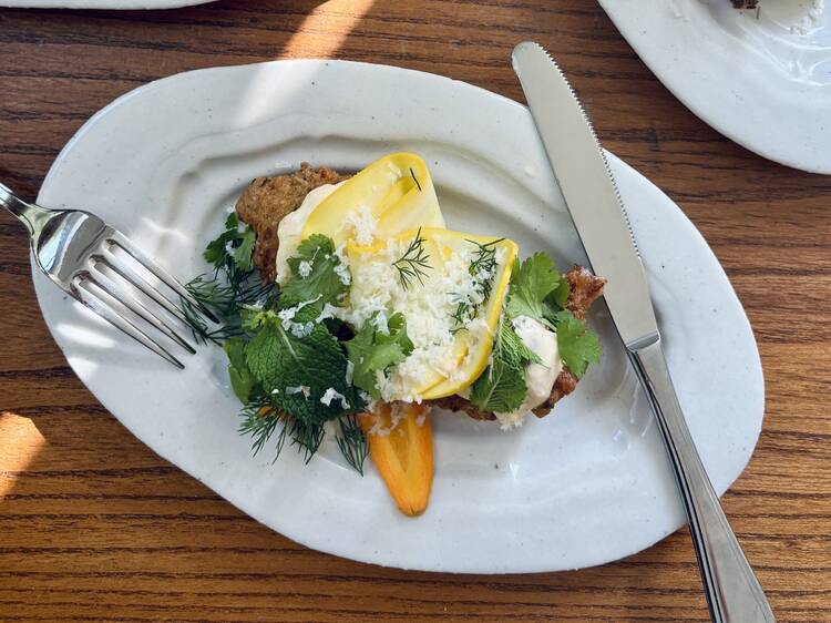 La suite se montre moins enthousiasmante. L’étique salade César végé se résume à 7 feuilles grillées et du kale frit, coiffés d'une chapelure à l’anchois et de quelques cheveux de parmesan. Dans le rodage de l’ouverture, les croûtons de « sourdough focaccia 72 h » annoncés manquent à l’appel… La bonne sauce citronnée n’y change rien, le prix de 19 € (avec un supplément de 6 € avec du poulet !) passe mal. L’autre plat, trois fraîches boulettes aux champignons et à la menthe sous une ricotta fumée, s’affiche à 20 € sans accompagnement. Ouille. À rebours de la tendance, Chez Carrie invente donc les petites assiettes au prix des grandes. Heureusement la carte des vins bio sait, elle, rester raisonnable : Mer et Coquillages du domaine Sylvain Meyer (29 €), Picrochole d’Ariane Lesné (40 €). Notre conseil : commandez donc plusieurs entrées pour découvrir une cuisine subtile et personnelle, sans vous sentir floué.