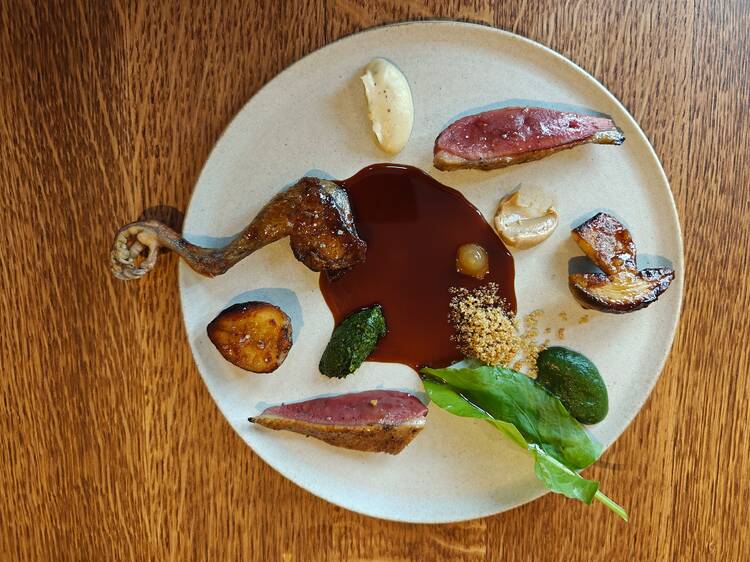 La dernière fois qu’on avait vu Nazareno Mayol Curti, il était tout sourire et de noir vêtu pour recevoir le « prix spécial du turfu » aux Time Out Food & Drink Awards 2025. Un prix caréné pour ce prodige de 29 ans, qui a fait des étincelles chez Mauro Colagreco, David Toutain ou Fulgurances. Et le revoilà, quelques mois plus tard, à inaugurer, avec sa complice Mara Ballester, Eme, son adresse chic aux ambitions ouvertement gastronomiques.
