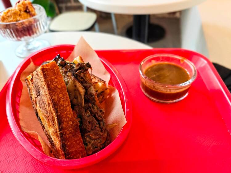 Le banger des lieux ? Le sandwich baguette Bourguignon hyper gourmand, avec carottes et paleron relevé de moutarde à tremper -innovation !- dans un ramequin de sauce de cuisson. Cela peut sembler anecdotique voire gadget mais, en réalité, cela transforme radicalement le produit, d’un en-cas à avaler vite fait, il devient un plat plaisamment libidineux à déguster avec les mains. Bien joué ! La formule à 15€ se complète d’une honnête boisson sans alcool (bissap, iced tea, citronnade au gingembre) et d’un dessert efficace ménager (un crumble pomme-cassis).