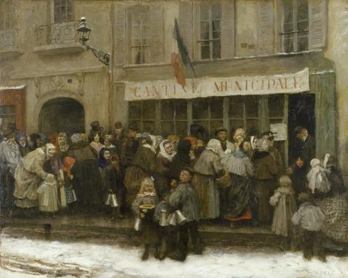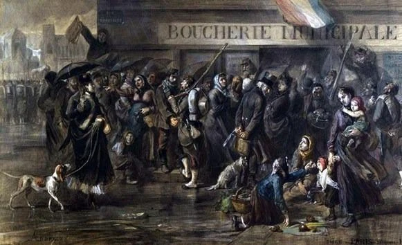 Très vite, les trains de ravitaillement sont coupés par les Prussiens ; en réaction, se met en place une organisation autogestionnaire pour alimenter Paris. Les stocks de blé permettent d’assurer un rationnement à peu près normal les premiers mois, des moulins de fortune sont même érigés pour moudre tout ce grain mais c’est la viande qui vient à manquer. Dînette rime alors avec disette, or les Parisiens très portés sur le bifteck, le lard et les abats voient d’un mauvais œil qu’on les rationne à 60 gr de barbaque par jour et par tête de pipe… et même à 30 gr (os compris) à la fin du siège.