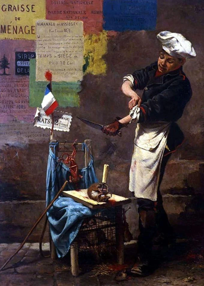 Le Paris de la fin du XIXe est une ville en expansion accélérée qui voit sa population doubler en 20 ans. Alors quand toutes ces bouches ont fini de boulotter les canassons, elles mettent la main sur les chiens et chats errants, les moineaux et pigeons des rues. Bientôt, un marché aux rats s’organise sur la place de l’Hôtel de Ville et des marchands de rongeurs improvisent des étalages sur les trottoirs. Le cuisinier Thomas Genin les prépare en terrine avec une farce de chair et de graisse d’âne. On vend des conserves de pâté de souris… avec la peau. La romancière Zénaïde Fleuriot raconte que les dames prenaient leur chien fermement dans leurs bras quand elles sortaient de peur de se les faire chiper et que Biscotte ne finisse en ragoût… Bref, on (fri)casse complètement les codes alimentaires, faisant gastronomie de tout morceau, au point qu’un recettier de pénurie intitulé La cuisinière assiégée est établi par une femme de ménage anonyme et inventive.