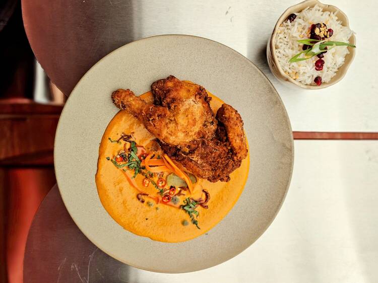 Ravioles de langoustine, réinterprétation du phò ou côte de bœuf en croûte de roquefort… Première constatation : la lecture de la carte laisse penser qu’on n’a pas tous eu la même enfance ! On entame avec une assiette de frites de polenta colorées par une poudre de cheddar pour une version gastronomique du Cheetos. Idée rigolote et gourmande mais lassante à la longue. Ça aurait été parfait en amuse-bouche (11 €). Puis un honnête duo de baos garnis d’huîtres panées sous une mayo pimentée au gochujang, avant le graphique plat de résistance : un poulet frit sur un tapis orange de sauce butter chicken. Un mix indien/coréen inédit et bien réalisé (chair marinée, panure croustillante, sauce veloutée) mais sans subtilité ni émotion. À accumuler les doudous dans l’assiette, la cheffe se perd en route…